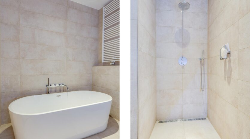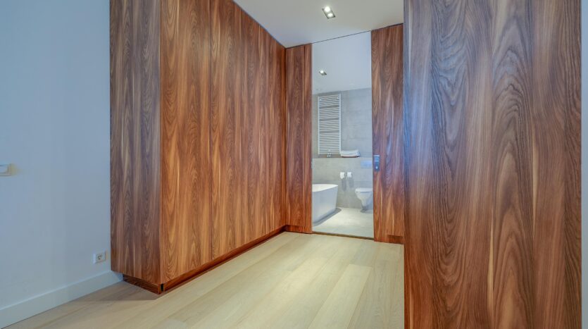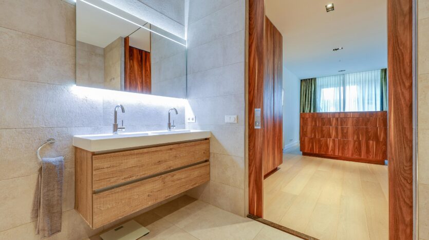 The spacious bedroom includes custom built-in wardrobes with an integrated bed frame. The luxurious bathroom is finished with large-format ceramic tiles in a natural stone look, and includes a walk-in shower, freestanding bathtub, double vanity with heated mirror, and a second toilet – all designed to offer both comfort and elegance.