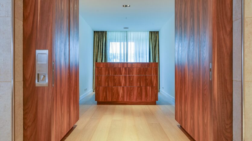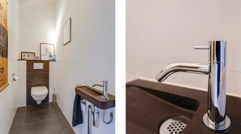 De ruime slaapkamer is voorzien van fraai afgewerkte inbouwkasten met bed-ombouw. Aansluitend de royale badkamer, die grootformaat keramische tegels in natuursteenlook combineert met moderne sanitaire voorzieningen voor een serene en stijlvolle uitstraling. De ruimte is voorzien van inloopdouche, vrijstaand ligbad, dubbele wastafel (met verwarmde spiegel) en tweede toilet.