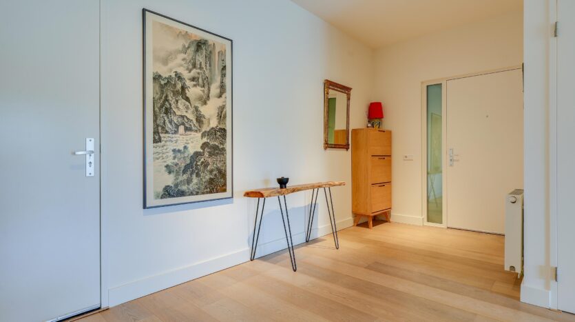 Via the communal entrance and elevator (or stairs), you reach the apartment on the second floor. Upon entering, a spacious hallway provides access to a large storage/utility room with washing machine connection and technical installations (including heat recovery ventilation system), as well as a separate toilet.