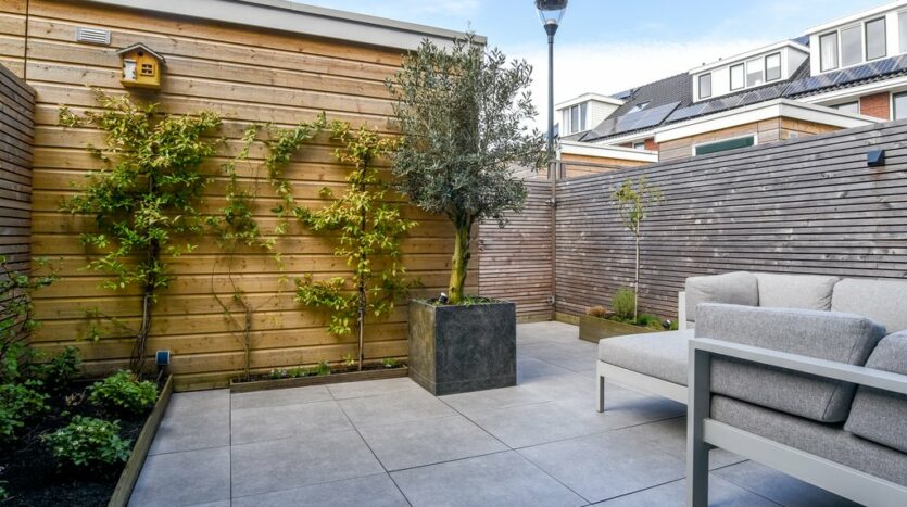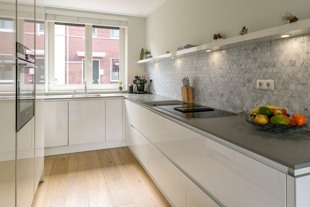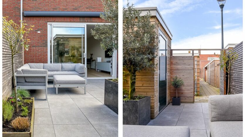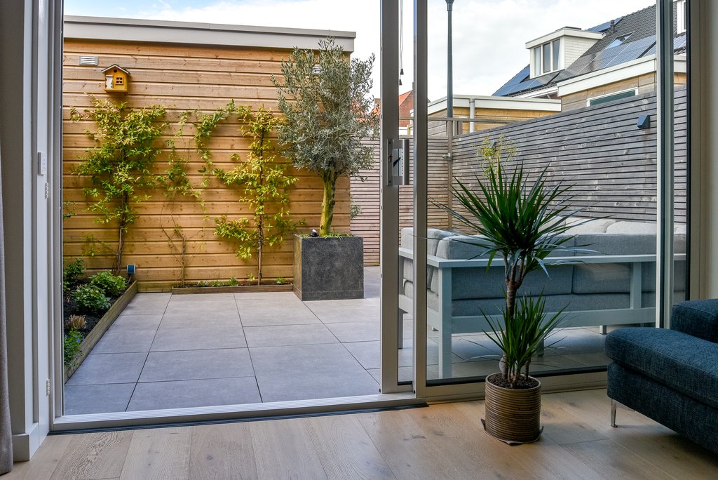 Begane grond en tuin: entree, ruime hal met mooi getegeld royaal, modern toilet met fonteintje, uitgebreide meterkast en bekleedde trap naar eerste verdieping. Lichte woonkamer voorzien van eikenhouten vloer, vloerverwarming, grote trapkast met planken en schuifdeur naar de moderne, gezellige achtertuin. Aan de voorzijde bevindt zich een luxe open keuken in L-opstelling voorzien van Siemens inbouwapparatuur (4-pits inductiekookplaat met afzuiging in het midden, vaatwasser, vriezer, koelkast, combi-oven/magnetron en een Quooker), veel kastruimte en een breed stenen aanrechtblad. De moderne achtertuin ligt pal op het westen en is daardoor zeer zonnig. Er is een elektrisch zonnescherm, een schuur met vide en achterom.