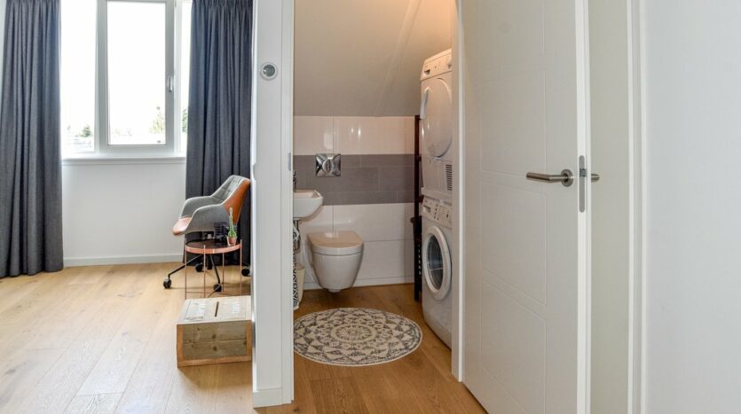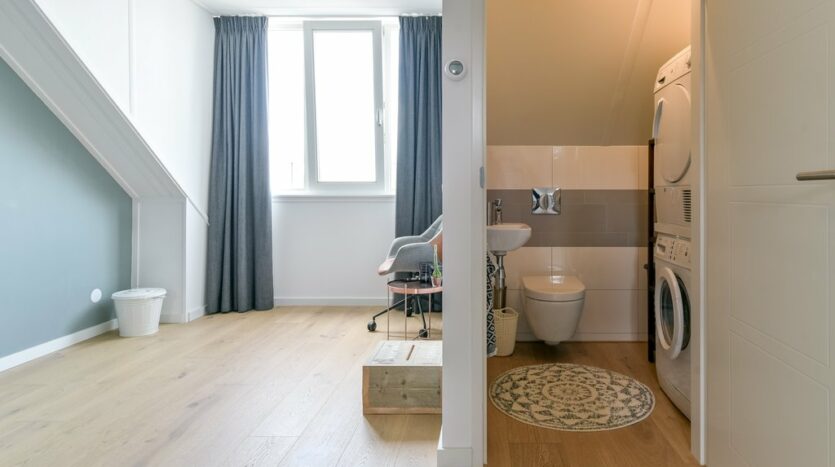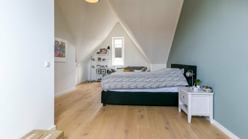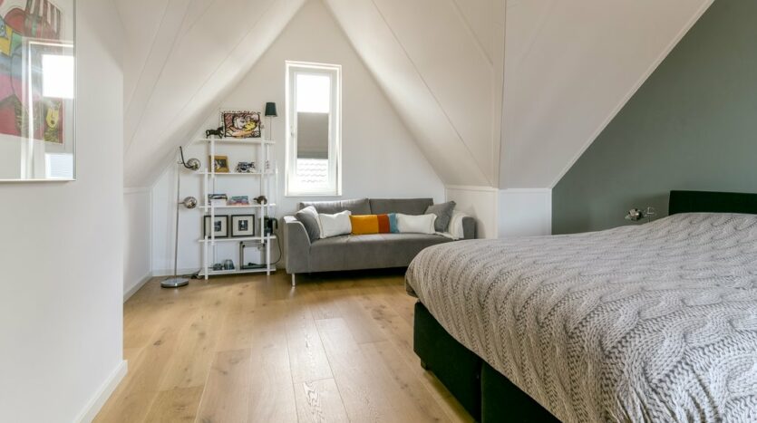 2e etage: de ruime zolder is een soort loft, met prachtige hoge plafonds (zicht tot aan de nok) en een grote dakkapel. De trap is volledig omgebouwd en er is een extra vide gemaakt, waardoor er veel bergruimte is op zolder. De wasmachine en droger zijn netjes weggewerkt in een apart 3e toilet met fonteintje. De tweede etage is tevens volledig voorzien van een eikenhouten vloer en vloerverwarming. Er is mogelijkheid om de zolder op te splitsen in een 4e en 5e slaapkamer.