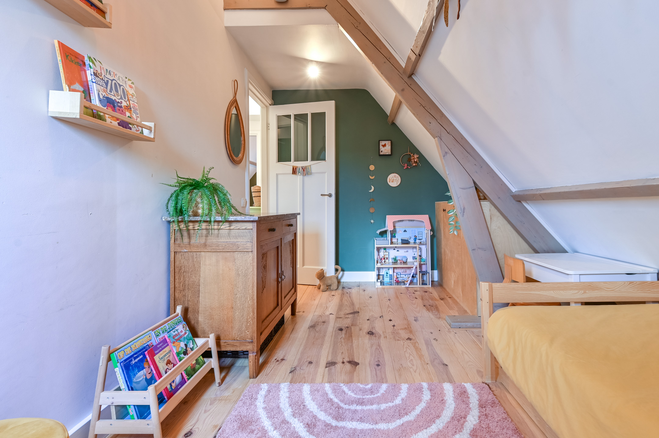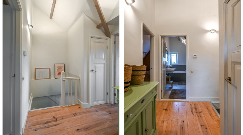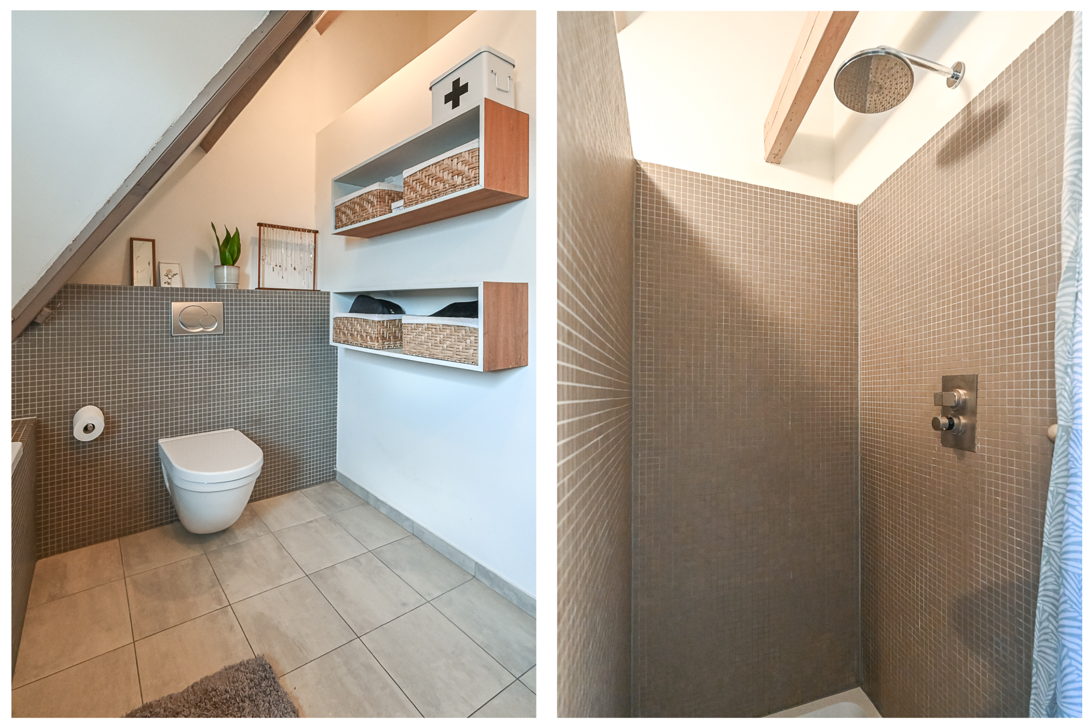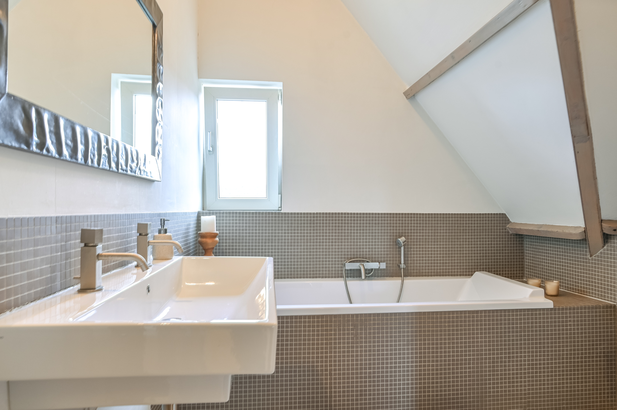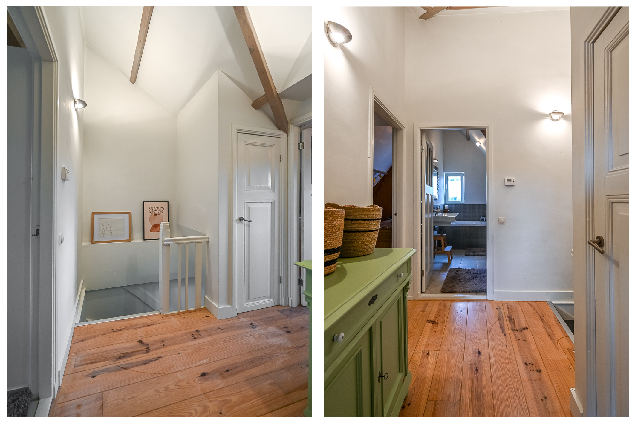 Second floor: Landing with a built-in wardrobe and the central heating system. At the front is a beautiful bathroom with luxurious fixtures: a walk-in shower, bathtub, third toilet, and double sink. Two spacious bedrooms are located at the front and rear. Like the rest of this floor, they feature exposed wooden roof structures, with a ridge height of almost 4 meters.