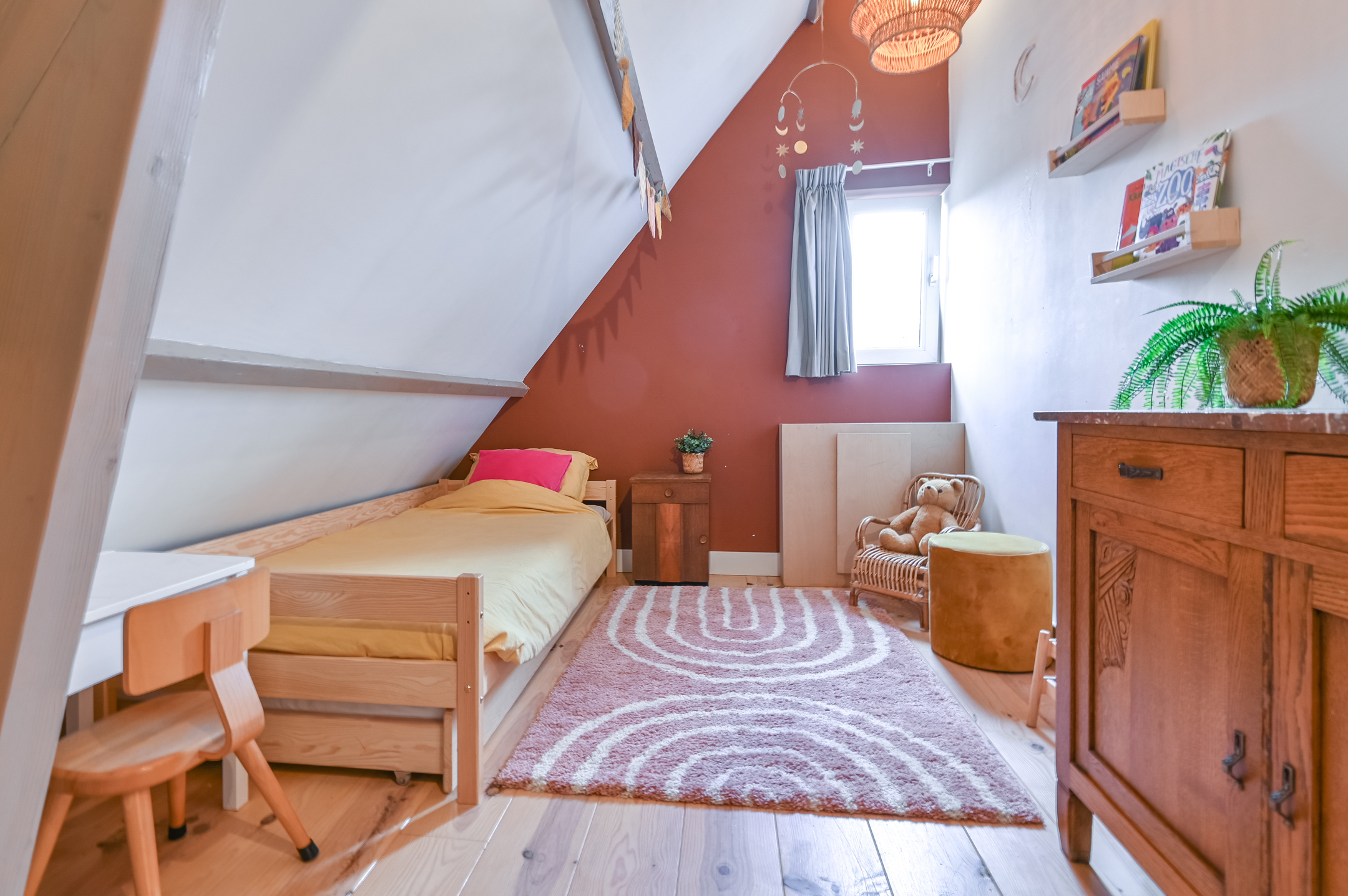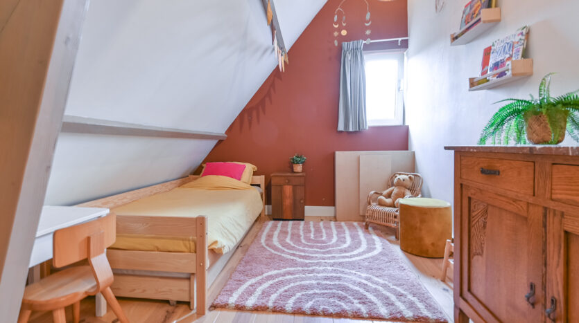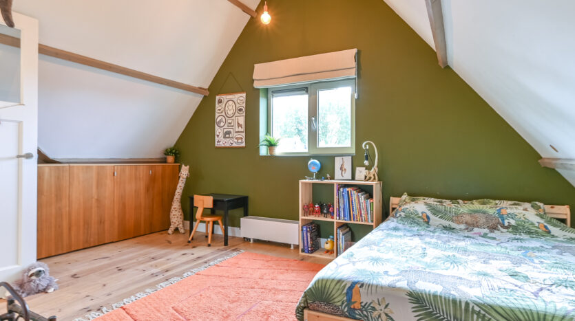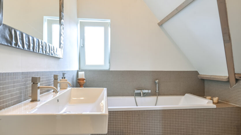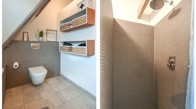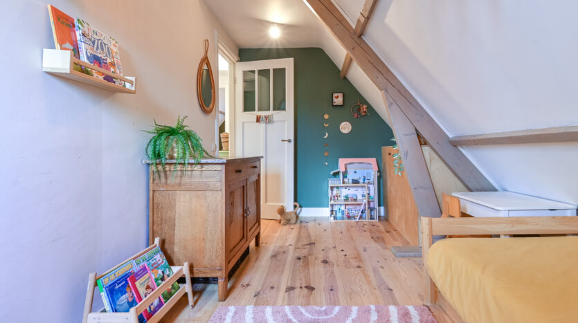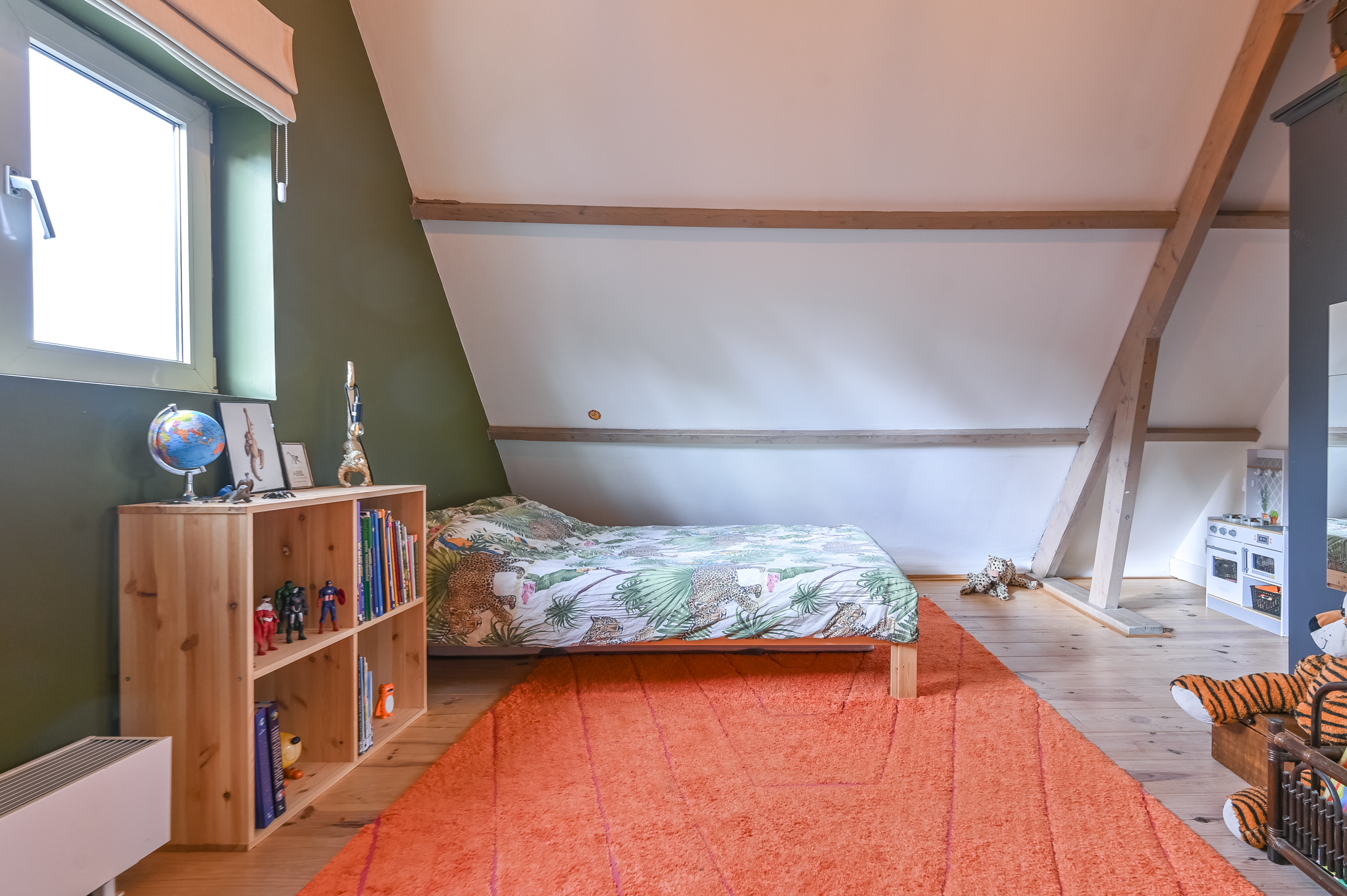 Second floor: Landing with a built-in wardrobe and the central heating system. At the front is a beautiful bathroom with luxurious fixtures: a walk-in shower, bathtub, third toilet, and double sink. Two spacious bedrooms are located at the front and rear. Like the rest of this floor, they feature exposed wooden roof structures, with a ridge height of almost 4 meters.