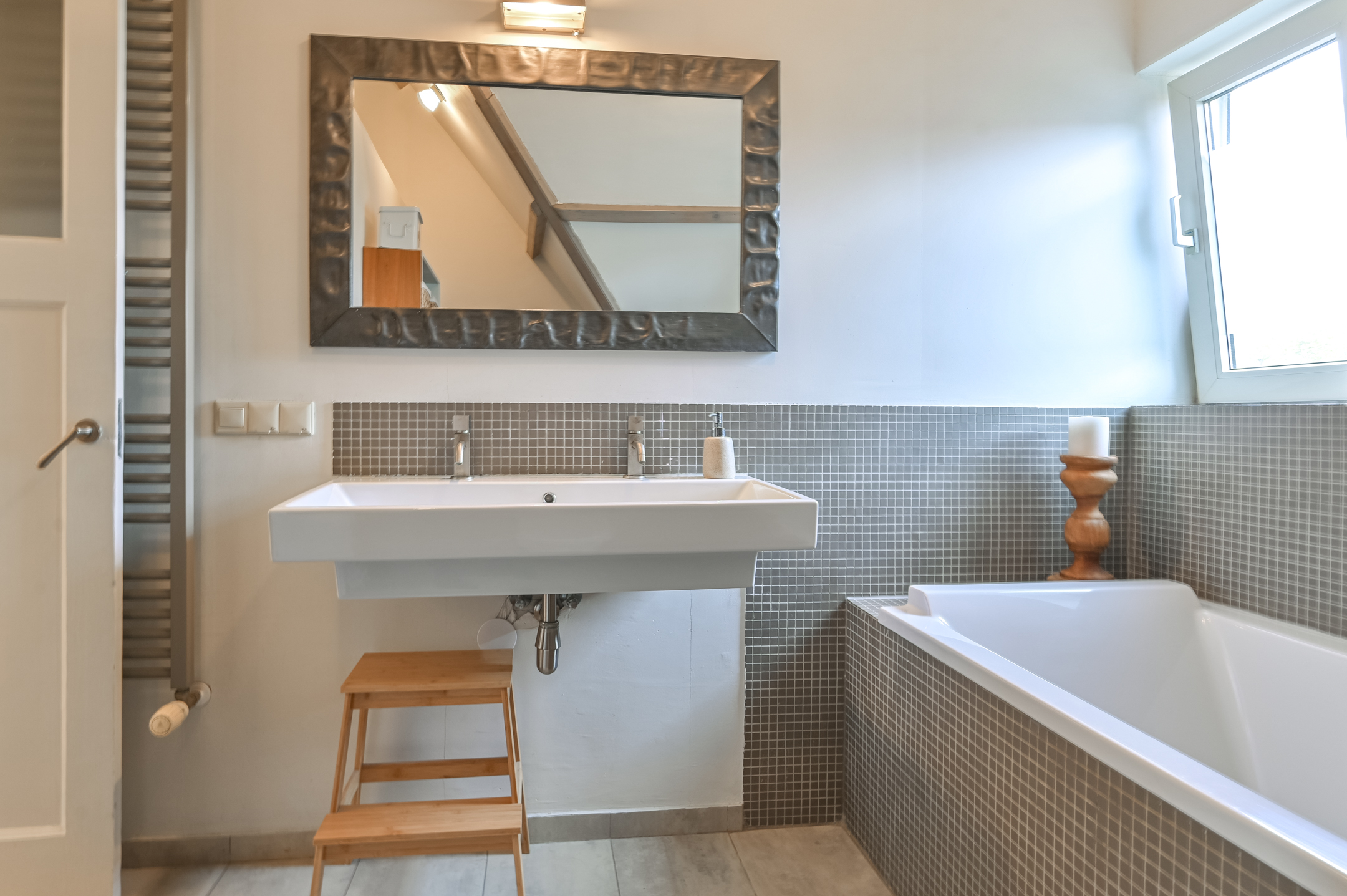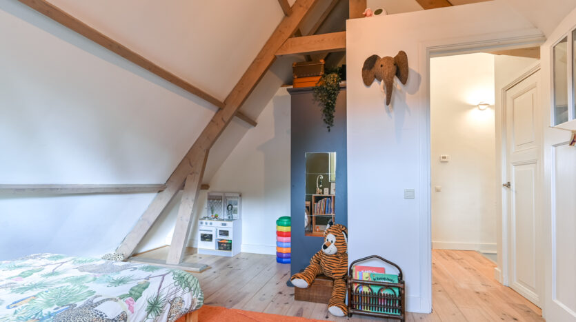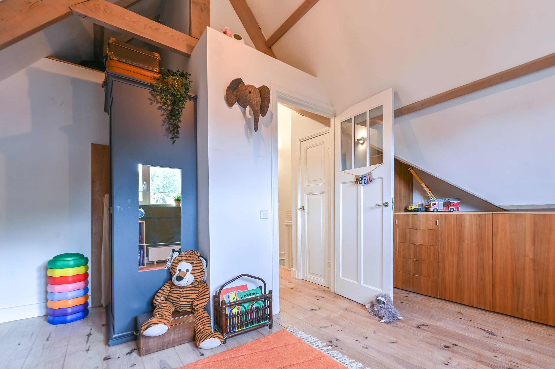 2e verdieping: Overloop met inbouwkast en CV-opstelling. Aan de voorzijde een prachtige badkamer met luxe sanitair: inloopdouche, ligbad, derde toilet en dubbele wastafel. Aan de voor- en achterzijde bevinden zich twee ruime slaapkamers. Net als de rest van deze verdieping hebben zij de houten kapconstructie in het zicht, met een nokhoogte van bijna 4 meter.