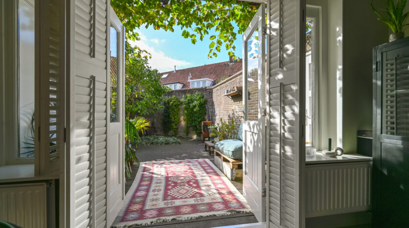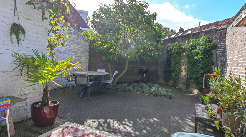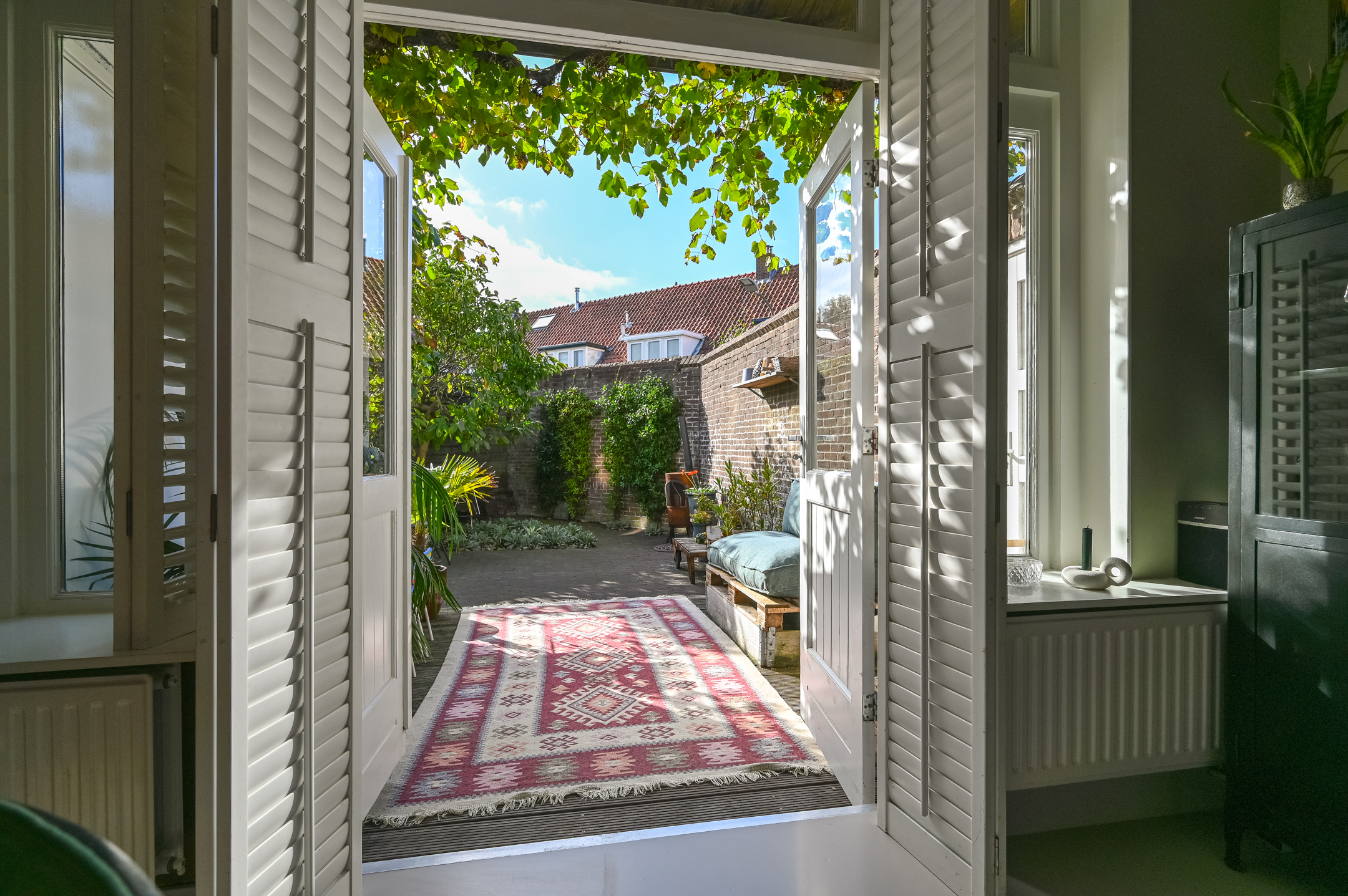 INDELING Begane grond: Toegang via de voortuin met fietsenstalling naar de entree/hal met meterkast en toilet met fonteintje. Ruime leefkeuken met groot kookeiland voorzien van Boretti gasfornuis, vaatwasser en afzuigkap. Onder de trap bevindt zich een praktische bergkast, en er is een aparte ruimte met aansluitingen voor wasmachine en droger. De bijkeuken/schuur is volledig geïsoleerd en eventueel later erbij te betrekken. Openslaande deuren leiden naar de gezellige stadstuin op het westen/zuidwesten, met veel privacy en een achterom.